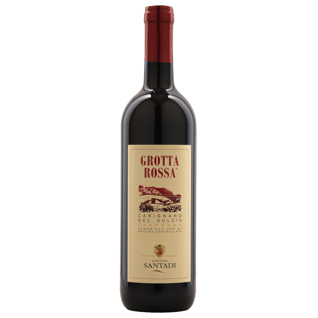 Founded in 1960 in the heart of Sulcis, Cantina Santadi is one of Sardinia’s most respected wine cooperatives. Deeply committed to local grapes, Santadi has made Carignano its signature variety. The grapes for Grotta Rossa come from vineyards planted on sandy and clay soils, near the sea and constantly refreshed by coastal breezes. The name “Grotta Rossa” pays homage to a local rock formation, symbolizing the deep bond between the wine, the land, and Sardinian history.