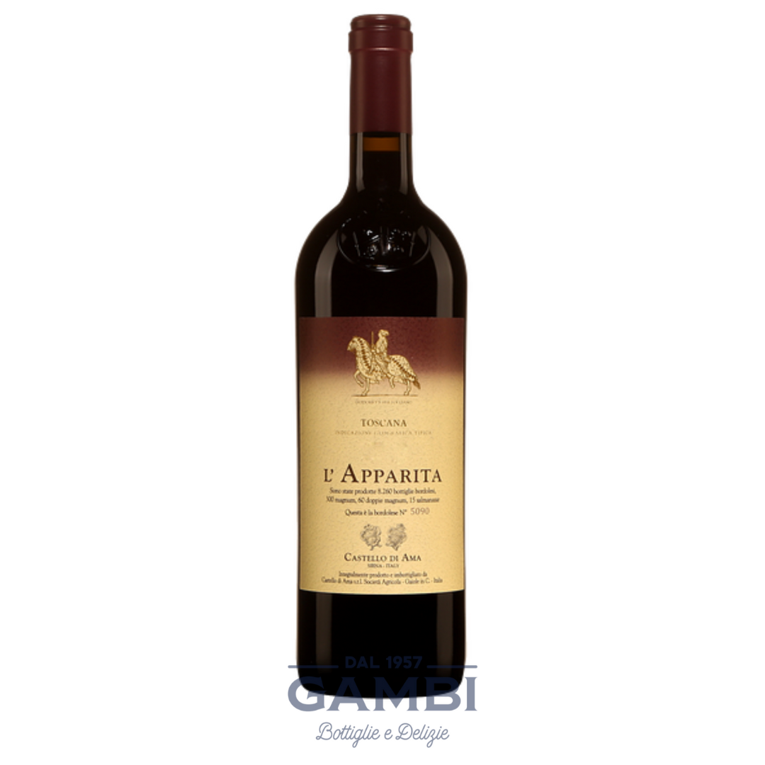 Only the best grapes from the two parcels of the L’apparita vineyard, right above the other famous Bellavista vineyard, contribute to the production of this Supertuscan. The particular conformation of the clay-rich soil is able to give great complexity to this wine. The harvest usually takes place around mid-September. Fermentation was induced with indigenous yeasts and carried out at a controlled temperature, around 30/33°C and the wine undergoes numerous pumping over for about 28 days. The wine undergoes malolactic fermentation in barriques. The wine also undergoes the aging period in barriques, half new and half used, for about 14 months; in particular this procedure will give great complexity and aromatic caliber to the wine.